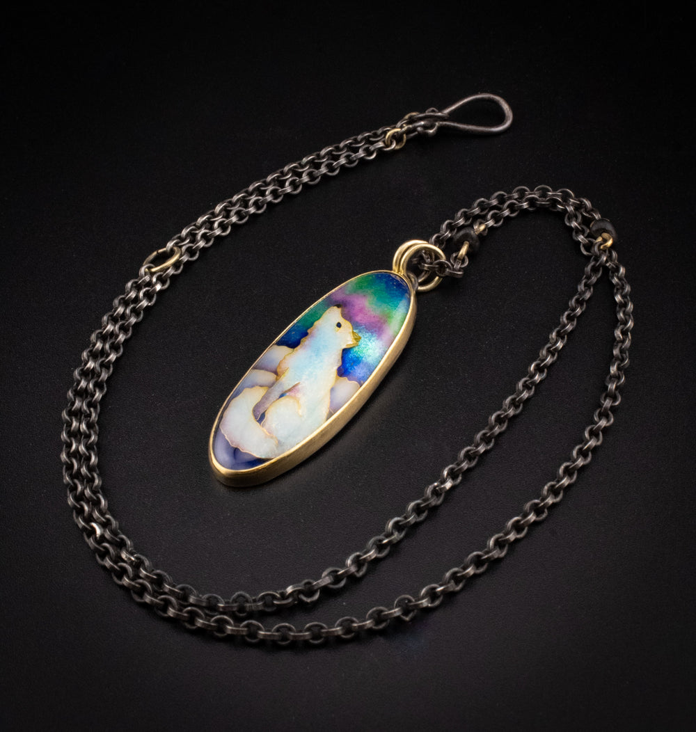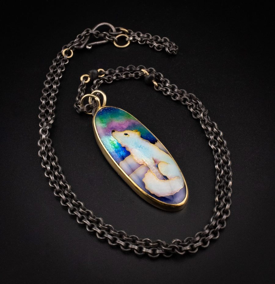 Made from glass enamel, silver, 24, 22, and 18k gold this pendant is a dreamy moment captured forever telling the story of a lone Arctic fox taking in the majesty of the