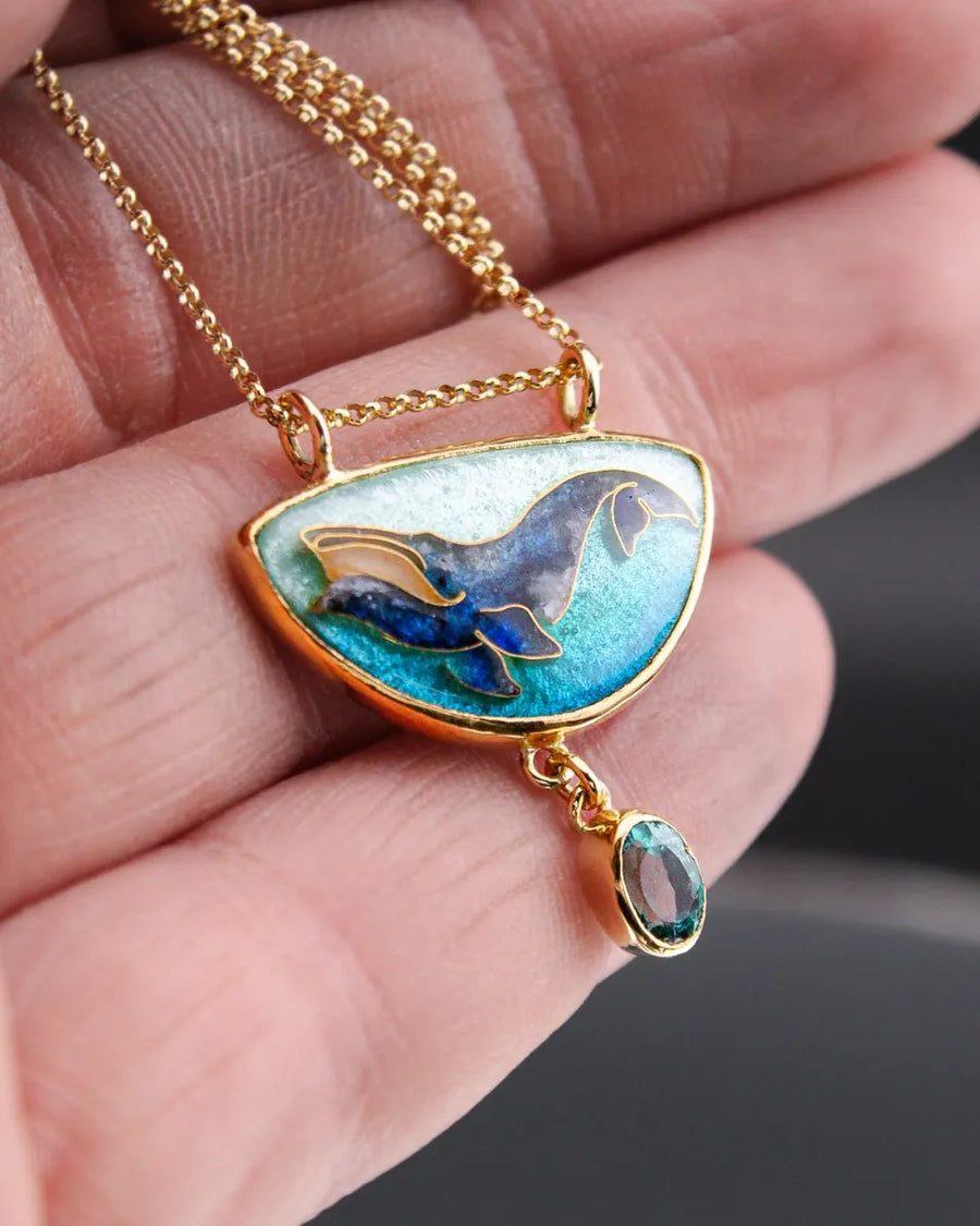 This Bowhead Whale Cloisonné is made from glass enamel, fine silver and 24k gold wire. The setting is made from 22k and 18k gold and the gemstone is a lovely faceted apatite.