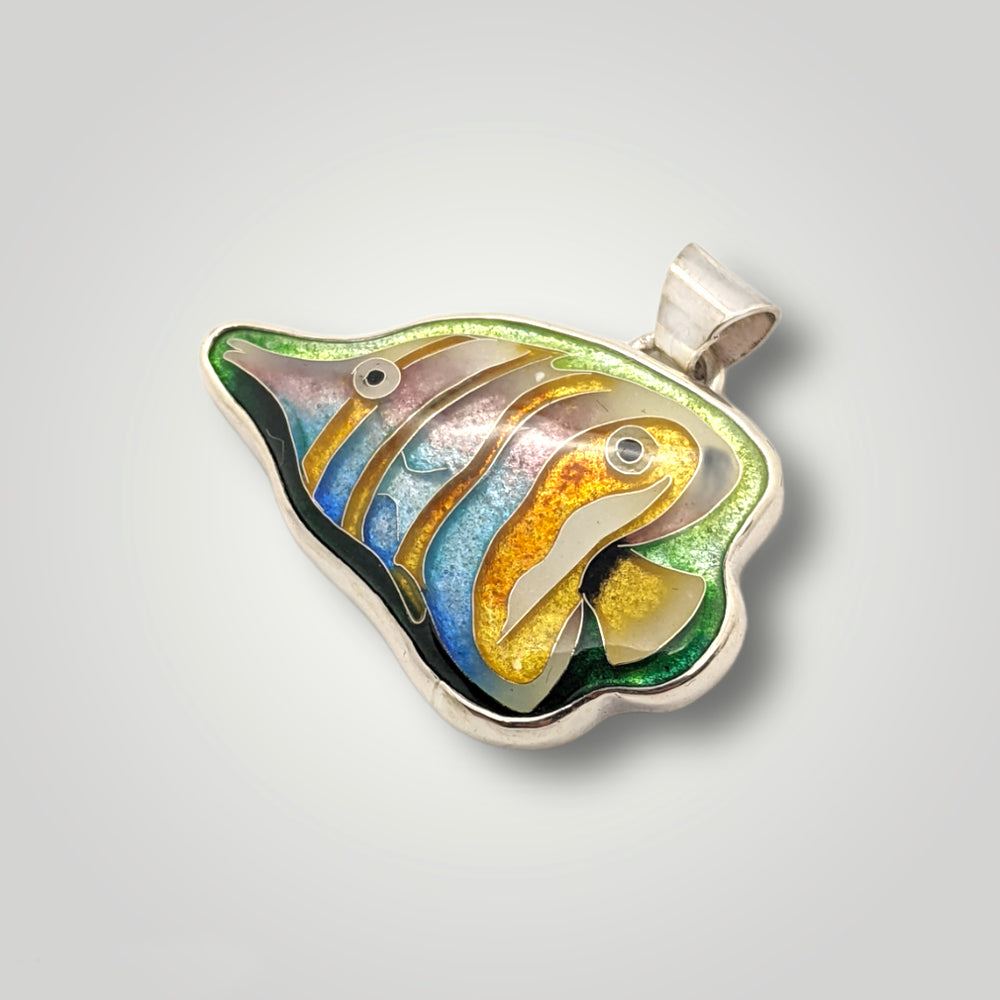 This Butterfly Fish is handmade from glass enamel, fine silver and set in a sterling silver setting.