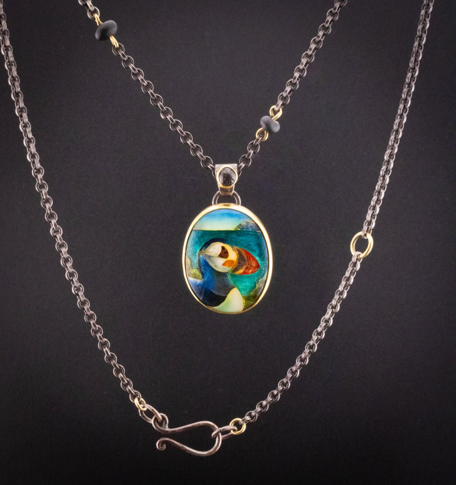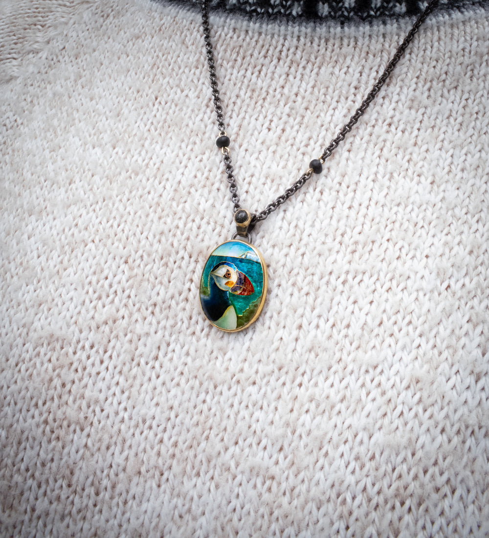 This necklace is a One of a Kind beauty inspired the migratory fishing bird, the Atlantic Puffin. More then 60% of the worlds population of Atlantic Puffins call Iceland home. This little Sea Parrots spend most of their lives out at sea diving up to 60 meters to find food.  This collectors item is handmade using 24k gold wire, fine silver and rich, colorful, glass enamel. The settings are a mixture of oxidized sterling silver, 22k and 18k gold made to resemble the stark contrasts of the Icelandic landscape. It is garnished with handmade cabochons created from Icelandic lava and on the chain are two pebbles hand collected from Víkurfjara Black Sand Beach.