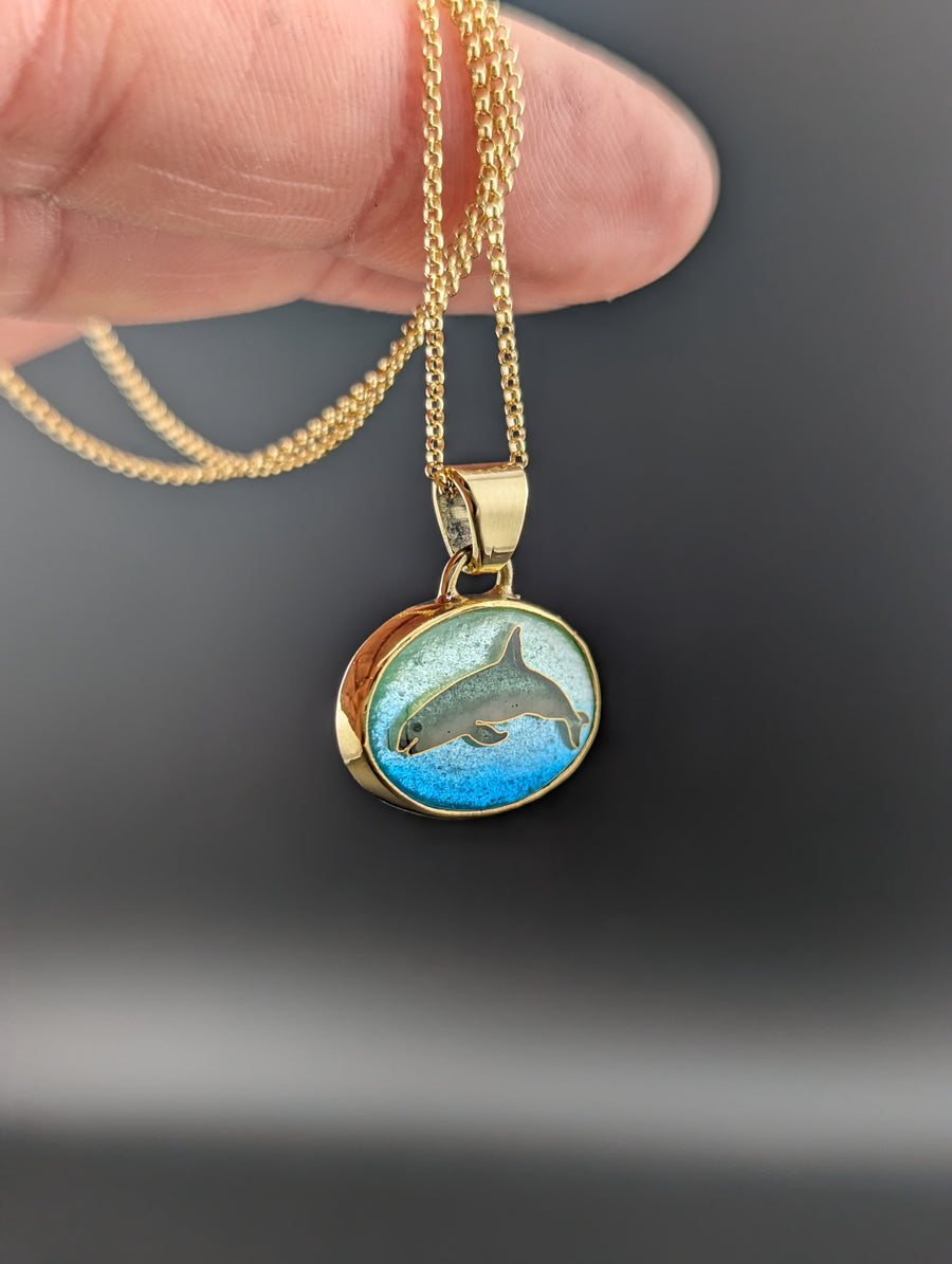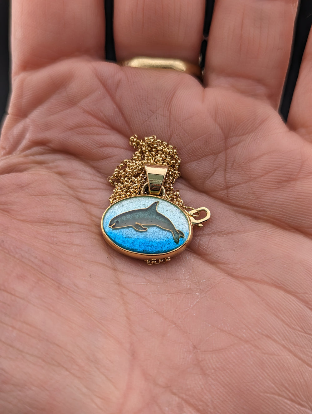 This cloisonné Vaquita is made from fine silver, 24k gold wire, glass enamel and mason stains. The setting is made from a mixture of 22k and 18k gold.