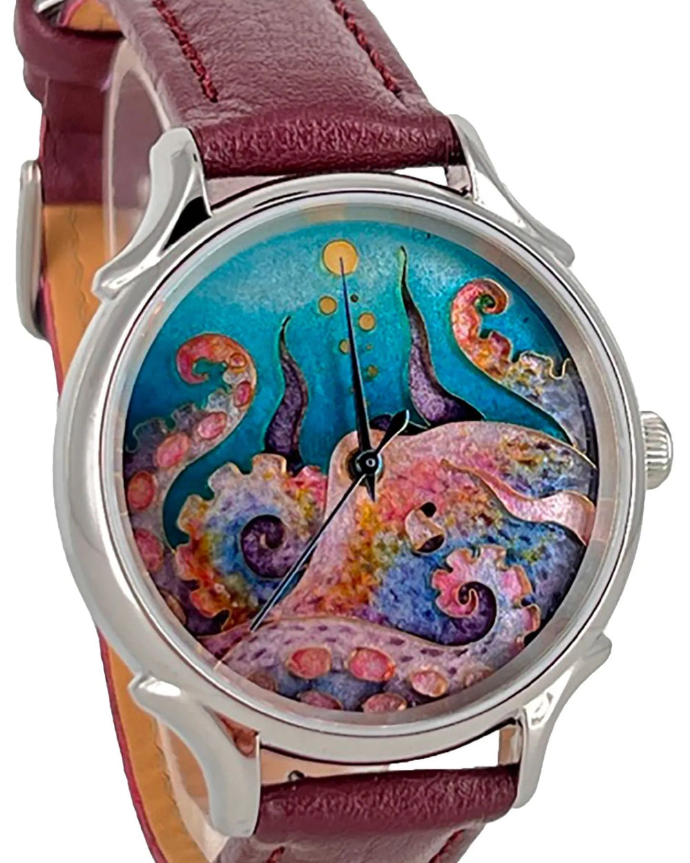 Be the owner of a rare high-quality cloisonné watch that will get people talking. This Octopus Watch is a Collaborative effort between Darci Shea Studios and Celeste Watch Company to bring you a rare high-quality product that will wow everyone who sees it.