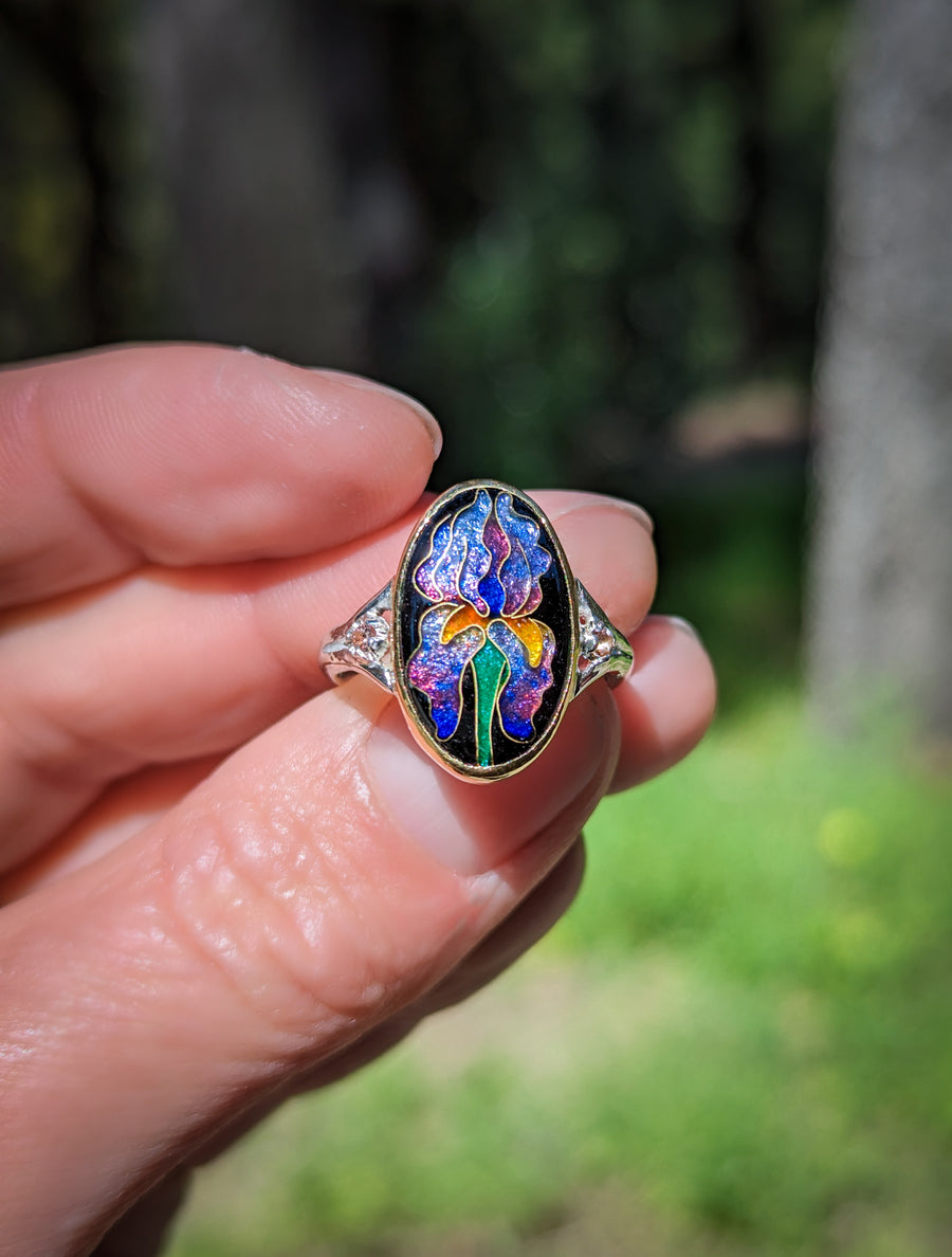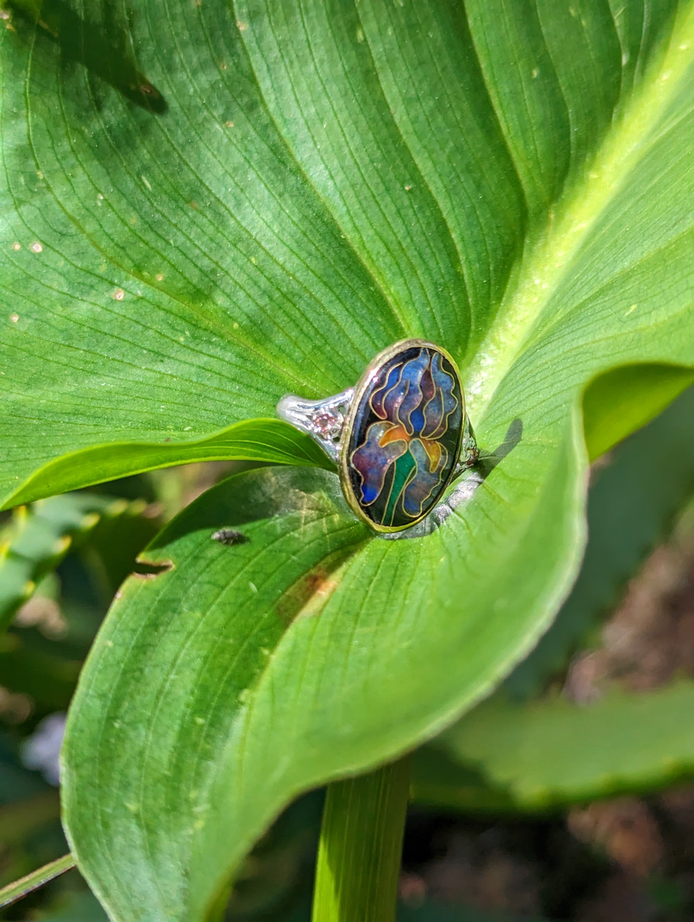 This lovely ring is made from glass enamel, fine silver, 24k and 22k gold, and peach topaz set in a sterling silver band.