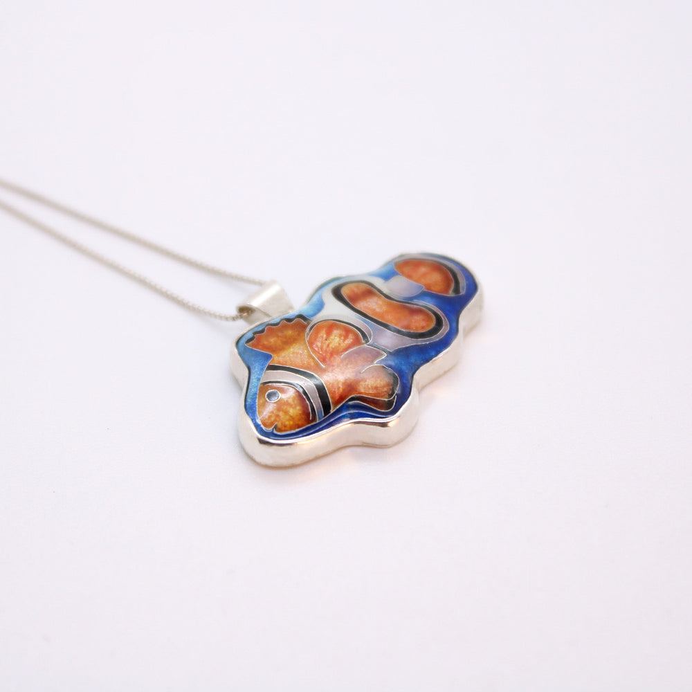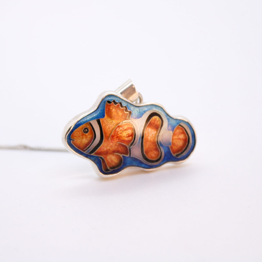 This Clownfish is handmade from glass enamel, mason stains, fine silver and set in a sterling silver setting.