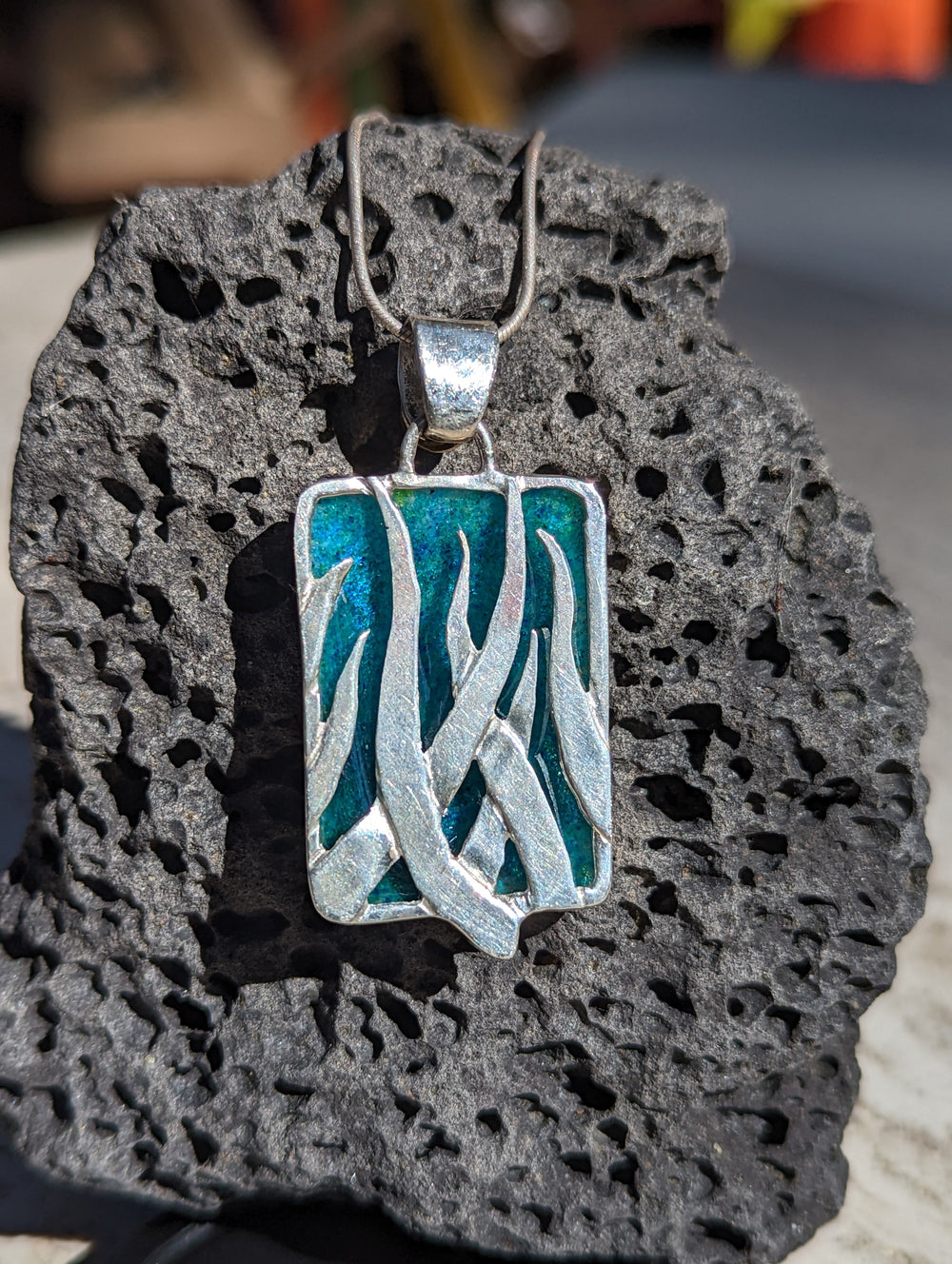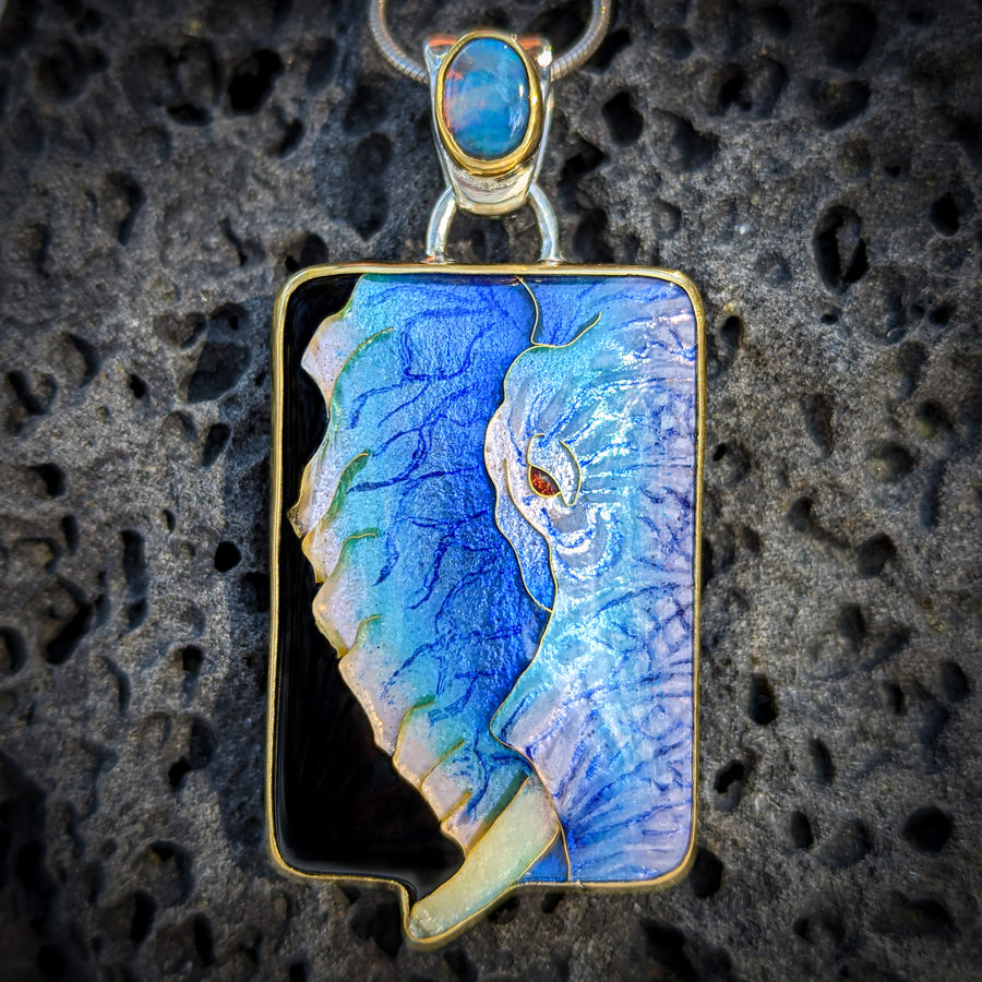 “Memory” is a handmade cloisonné enamel pendant inspired by the incredible Elephant. This piece is made from 24k gold, glass enamel, Mason stains, and painting enamel on fine silver. The enamel is set in a carved sterling silver setting and 22k gold bezel. The bail showcases an Opal doublet with colors that perfectly match the colors of the piece.