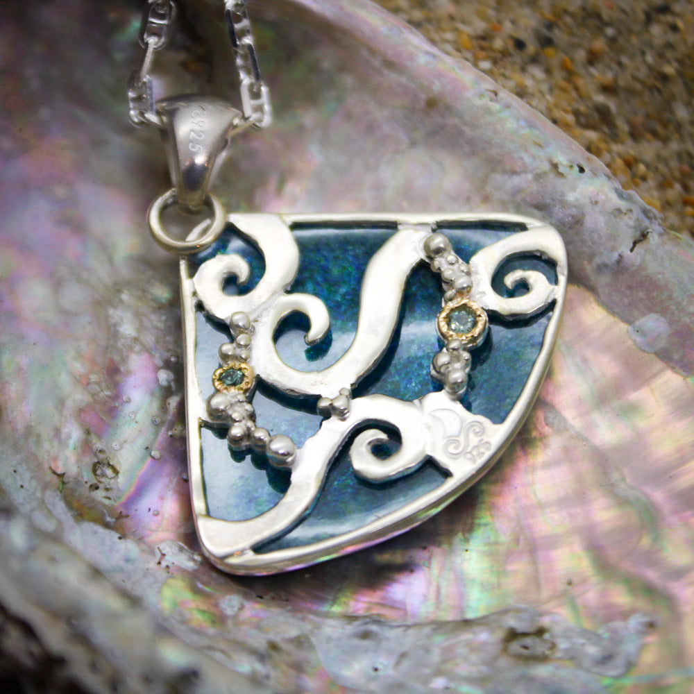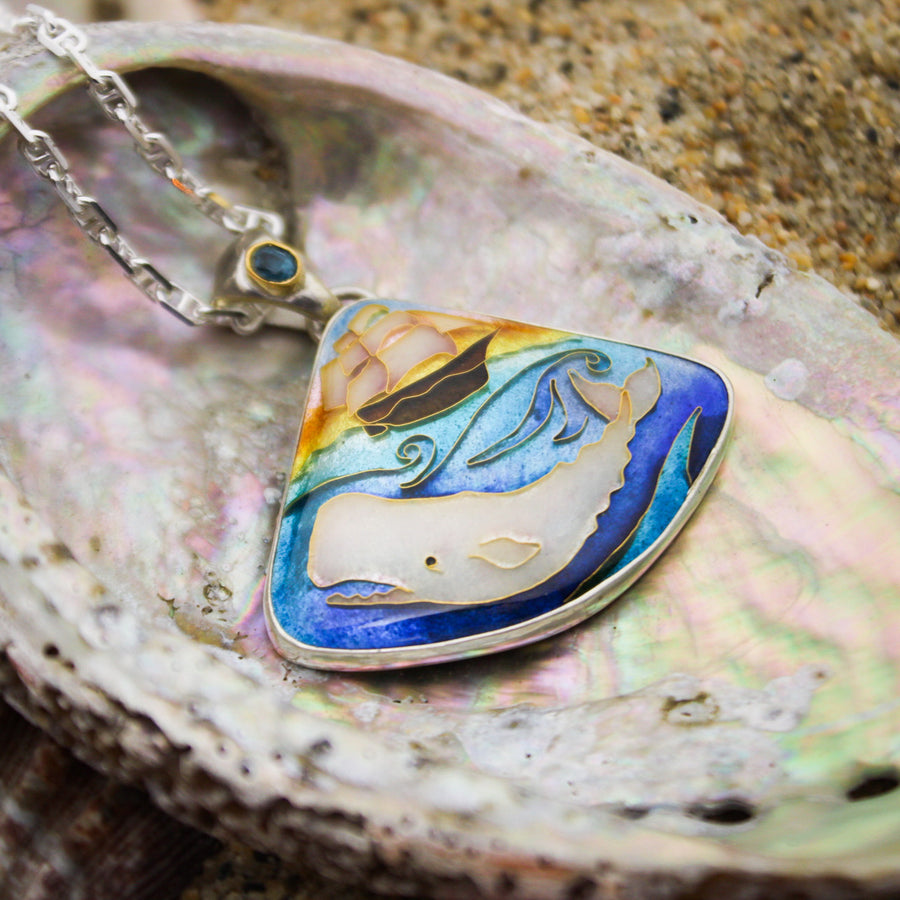 The White a Whale Cloisonné Pendant is made from cloisonné enamel and fine silver. It is set in a hand-carved sterling silver setting encrusted with with teal Montana Sapphires set in 14k gold octopus settings. The bail showcases a beautiful teal/blue Kyanite set in 22k gold.